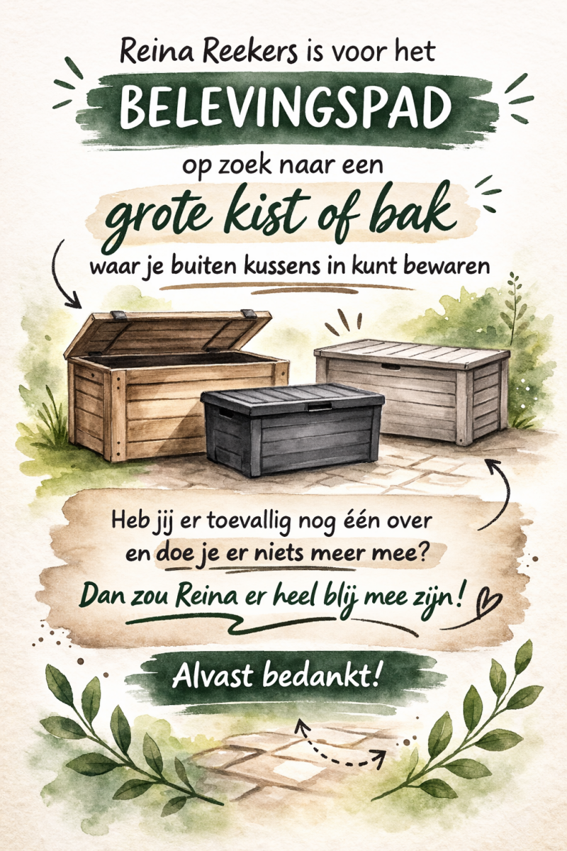 Groeiromte.reina is voor het pad (belevingpad) op zoek naar een grote kist of bijvoorbeeld zo'n bak waar je buiten kussens in kunt bewaren. Kom niet zo precies. Wellicht heeft iemand deze over en doet er niets mee?