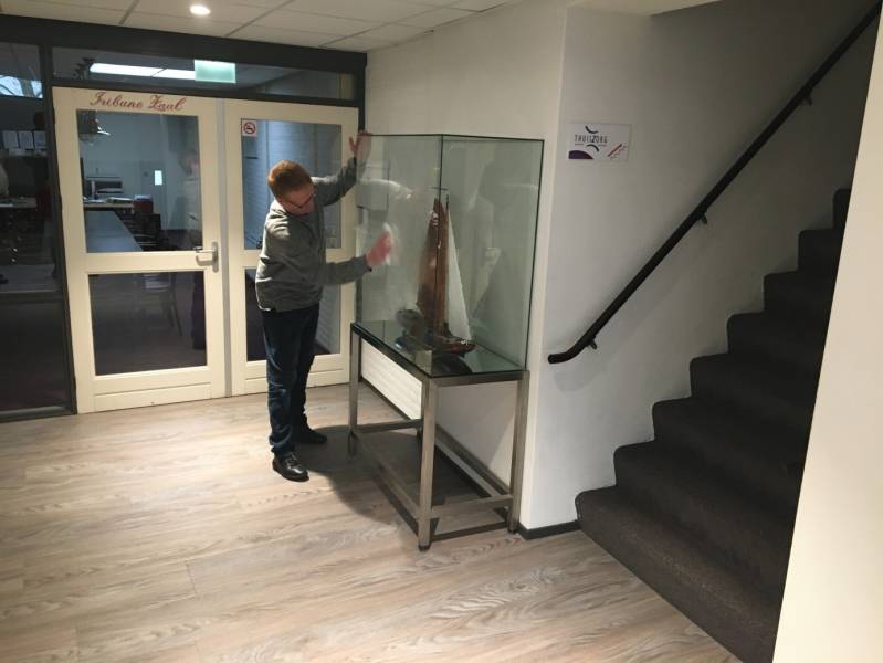 In Woudsend heeft het skûtsje, na wederom het nodige gekloot, een prachtige plek gekregen in het MFC van beheerder Theo. Na een fotootje togen Lucas en ik weer richting kantoor. Een blik over mijn schouder toonde mij een beheerder die liefdevol met een pot Glassex in de weer was om alle bloed, zweet en tranen van de vitrine af te poetsen. Het skûtsje is thuis en heeft weer een mooie prominente plek gekregen.