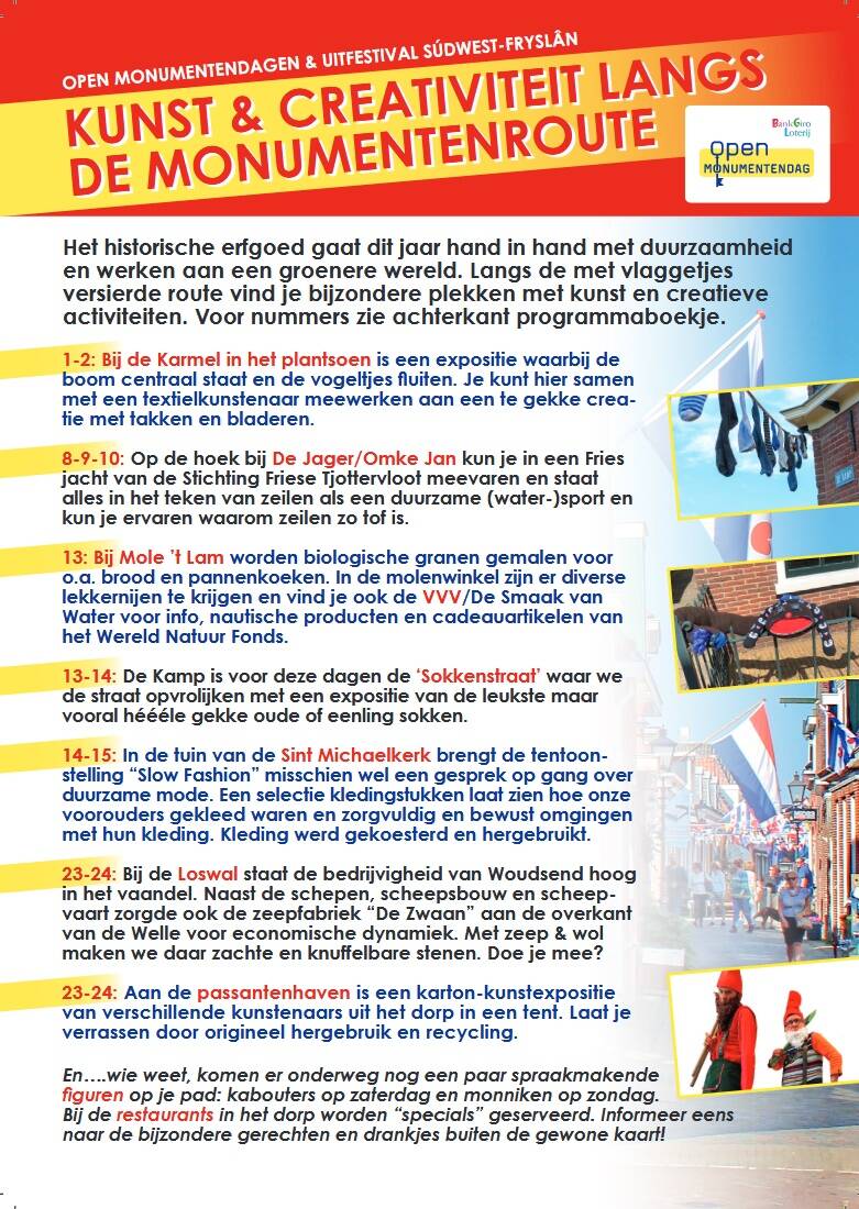 Er is een monumentenroute door de oude kern van het dorp met informatie op de gevels van de monumenten. De unieke molens, kerken en de oudheidkamer De Parel zijn open voor bezichtiging. Langs de route is kunst en creativiteit van inwoners te zien en te doen in het kader van het thema van de Open Monumentendagen: Duurzaamheid.