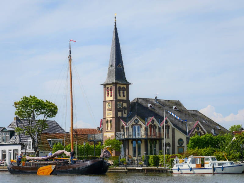 Het voormalige kerkgebouw doet nu dienst als particulier woonhuis en is nu een opvallende gebouw aan de oever van de ’s zomers druk bevaren Ie.
